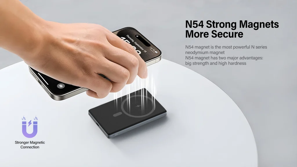 سطح پشت پاوربانک مجهز به آهنربای قوی (مگنت N54) است تا بهطور امن گوشیهای سازگار را نگه دارد.